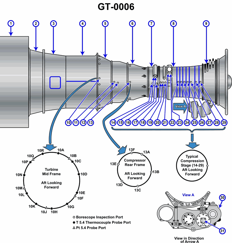 On the gas turbine engine shown in the illustration, the "T5.4" thermocouples are ______. See illustration GT-0006.