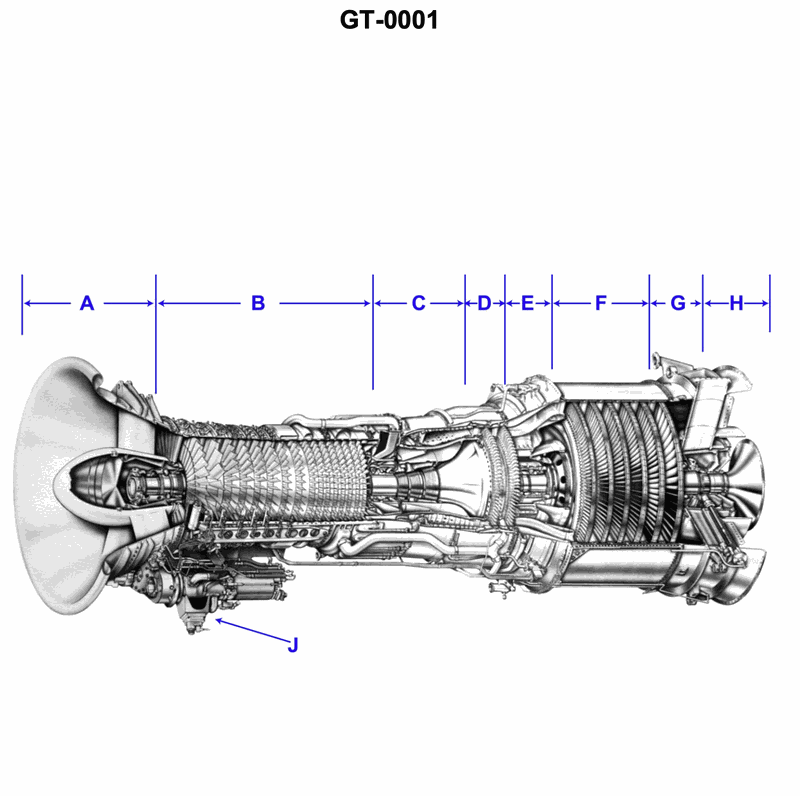 On the gas turbine shown in the illustration, which of the following best describes the main principle of operation of the component contained within the area labeled "C"? Illustration GT-0001