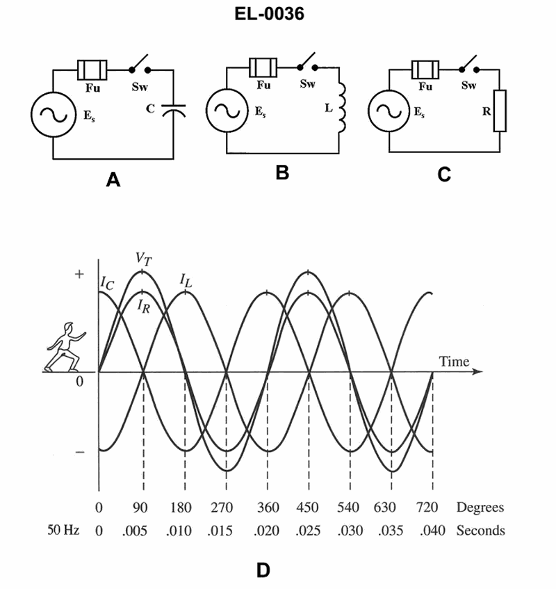 Referring to figures "C" and "D" of the illustration what is the phase relationship of current to voltage in a purely resistive circuit? See illustration EL-0036.