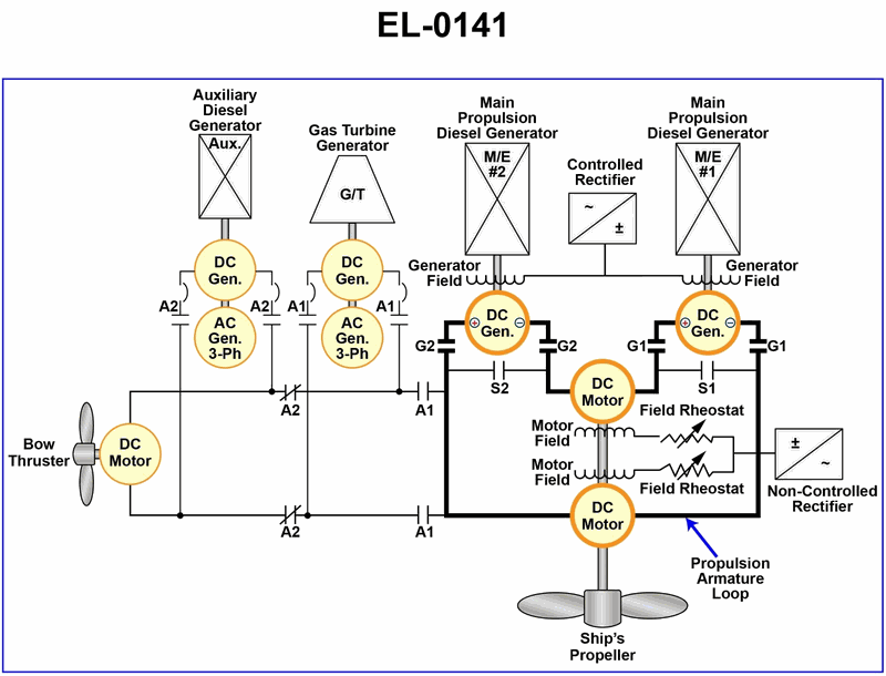 Referring to the illustration of a DC diesel-electric drive system, what type of DC propulsion motors are used? Illustration EL-0141