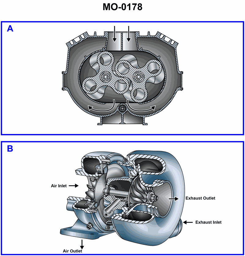 Suppose your ship docking tug is equipped with 4-stroke diesel generator set drive engines fitted with the type of charge air blower show in Fig. "B" of the illustration. In terms of the pressure of the charge air entering the intake manifold, what statement is true? Illustration MO-0178