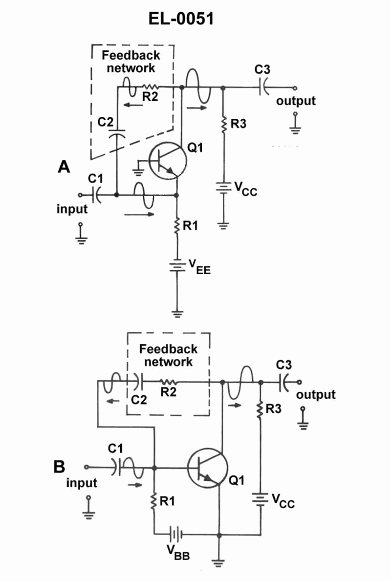 The amplifier as shown in figure "B" of the illustration has what type of feedback network? See illustration EL-0051.