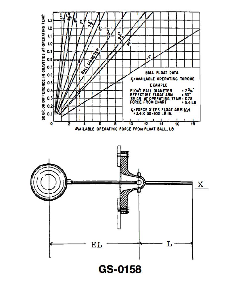 The ball float shown in the illustration has a circumference of 18.85" and is used in water with a specific gravity of 1.0. If 16 pounds of force is available at "X", and the effective length of the float arm is 24 inches, what is the length of "L"? See illustration GS-0158.