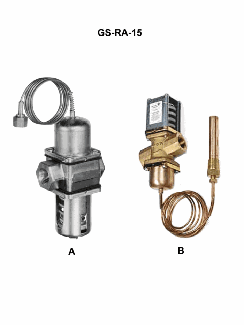 The device in figure "B" of the illustration is used to control the flow of water through a water cooled condenser of a refrigeration unit. Where would the thermal bulb sensing well be located? See illustration GS-RA-15.