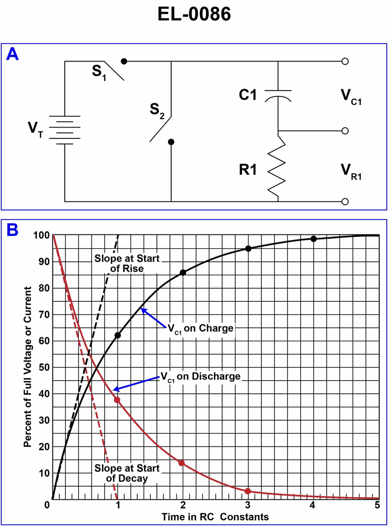 The diagram shown in the illustration demonstrates one of the useful properties of an 'RC' time constant circuit. In terms of the charging and discharging cycles of "C1", what statement is true? See illustration EL-0086.