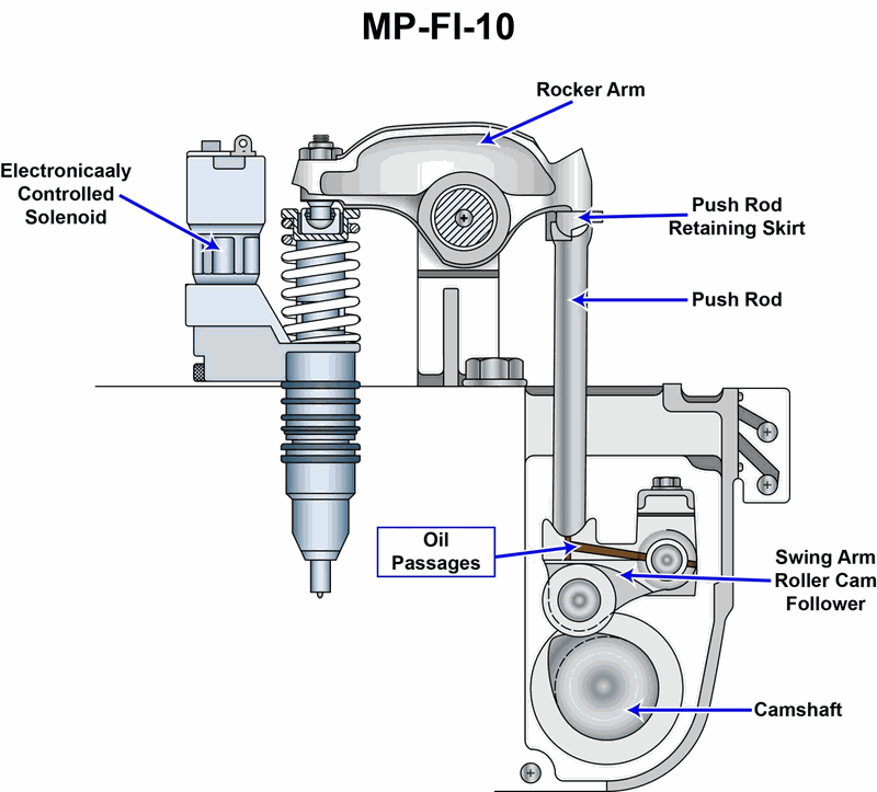 The drilling platform supply vessel to which you are assigned has diesel generators fitted with unit injectors of the type shown in the illustration. What statement is true concerning the operation of unit injectors of this type? Illustration MO-0143
