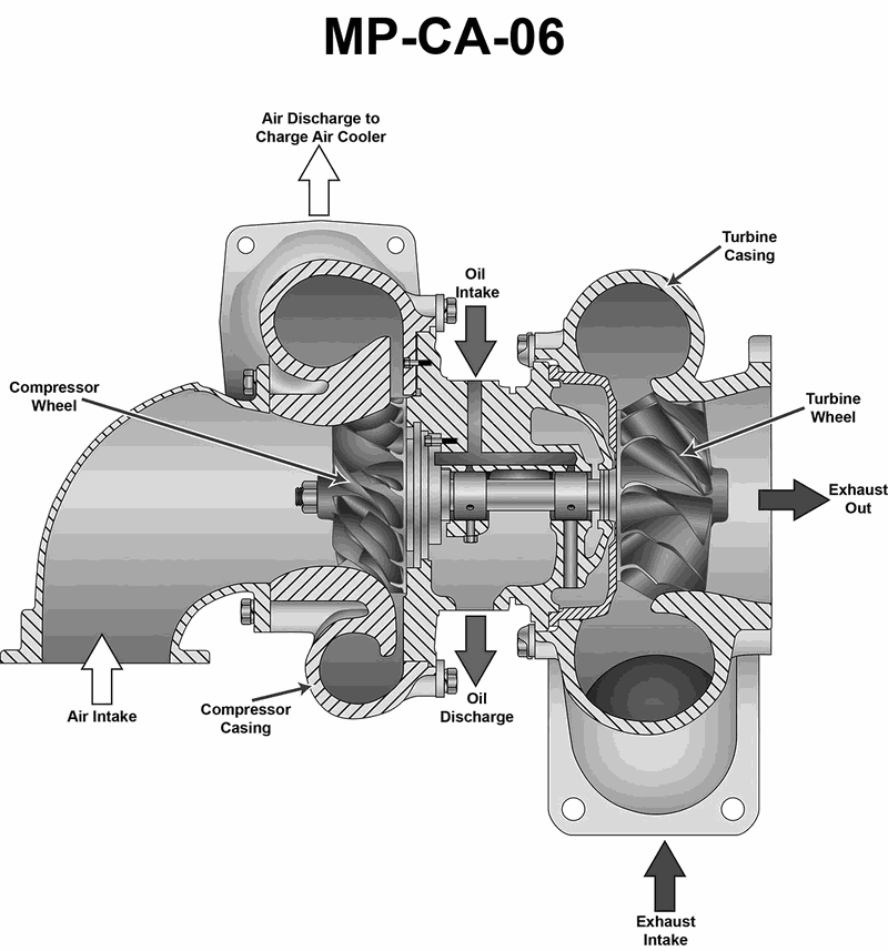The fire pump drive engine on the salvage tug to which you are assigned is fitted with a turbocharger as shown in the illustration. What statement is true concerning this type of turbocharger? Illustration MP-CA-06
