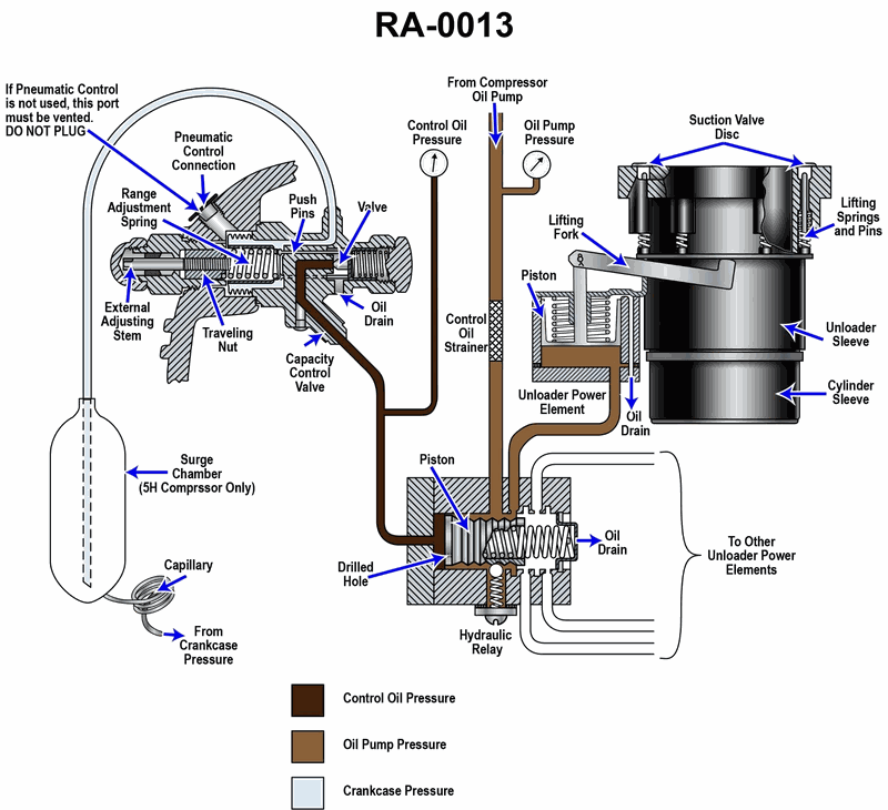 The fluid used to act against hydraulic relay piston to control how many cylinders are unloaded in the refrigeration compressor capacity control system illustrated, is obtained from where? See illustration GS-RA-13.