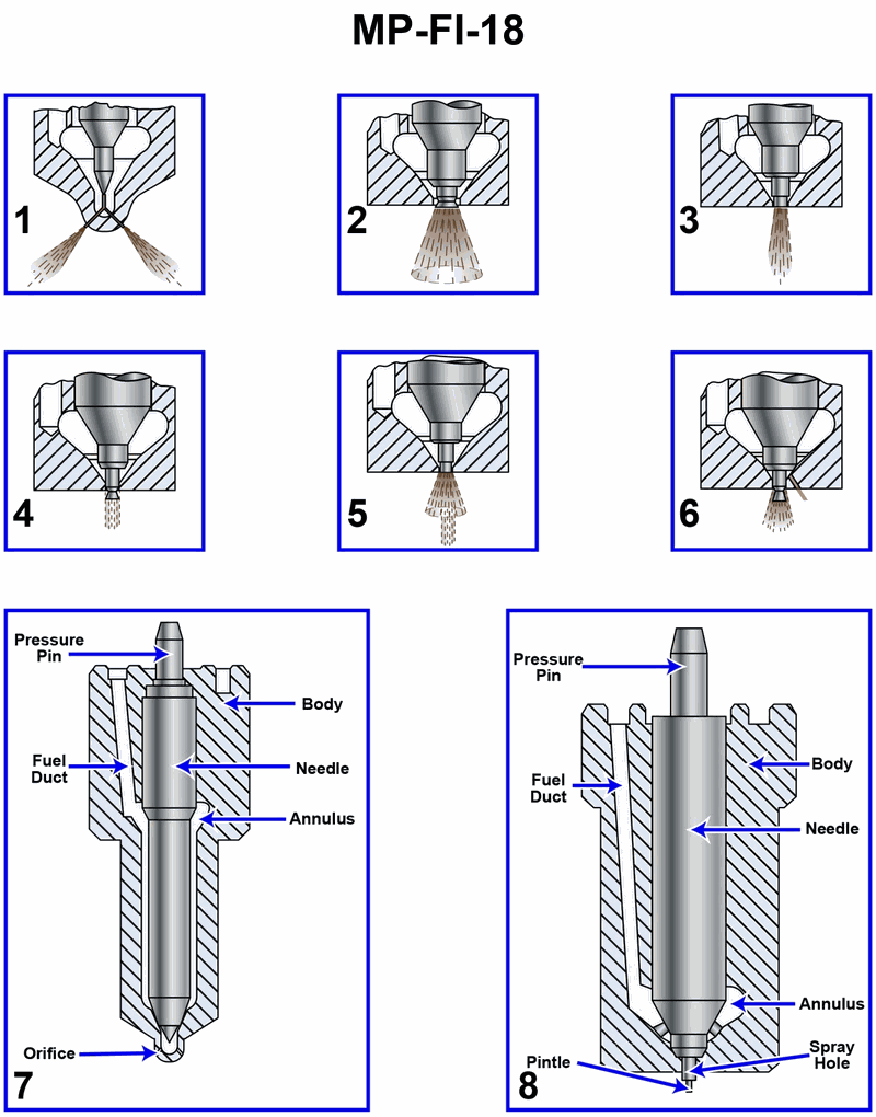 The harbor tug to which you are assigned has main engines fitted with open type combustion chambers featuring direct injection. Of the listed figures below found in the illustration, which figure represents the most likely type of injector nozzle type? Illustration MO-0148
