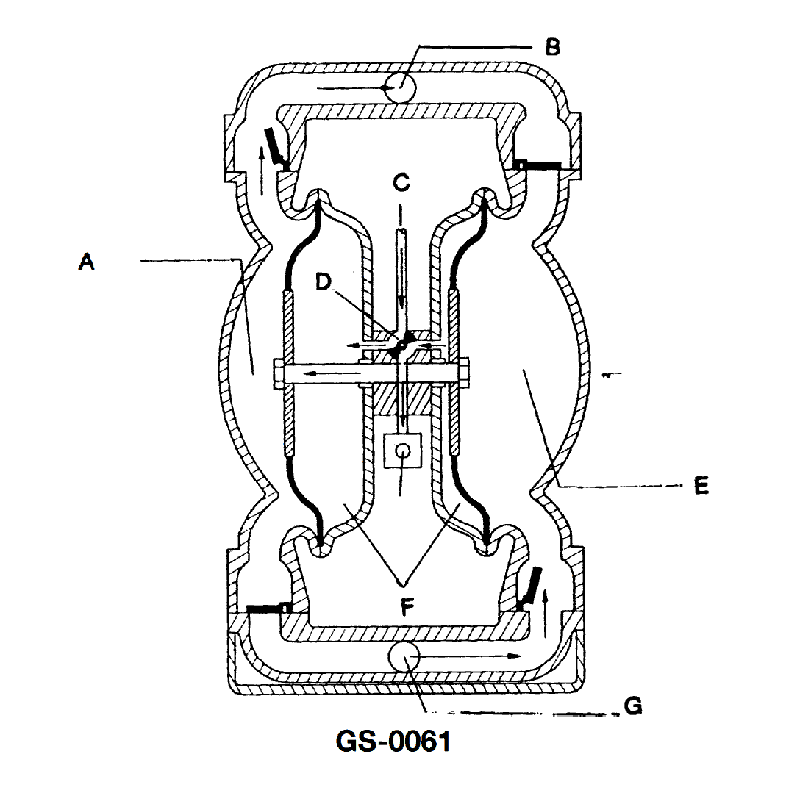 suction of the transferred liquid occurs at "B" and discharge at "G"