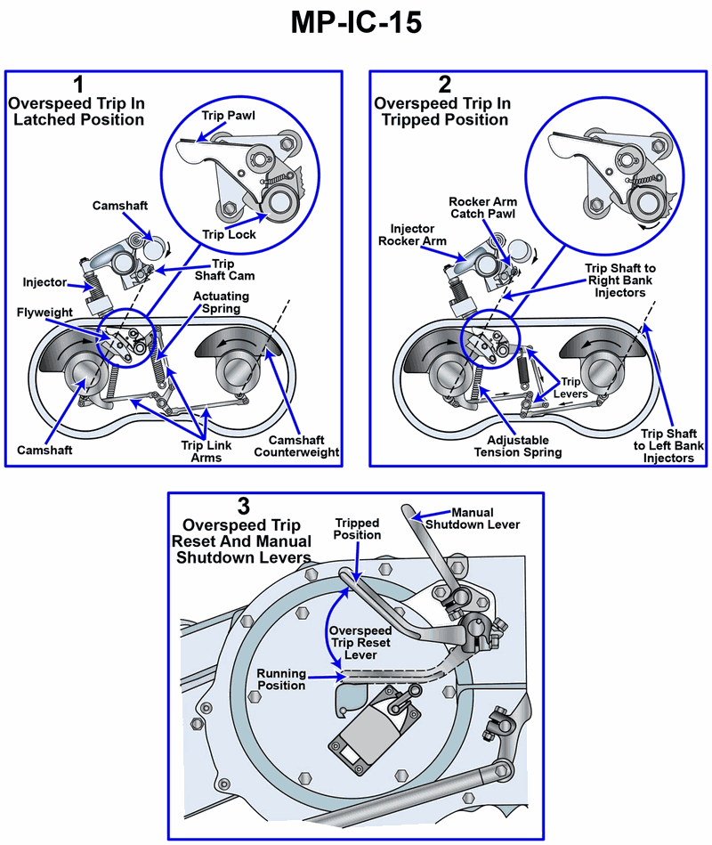 A trip shaft cam positions all the unit injectors plungers to the top of their respective strokes, preventing plunger reciprocation, which results in engine shutdown.