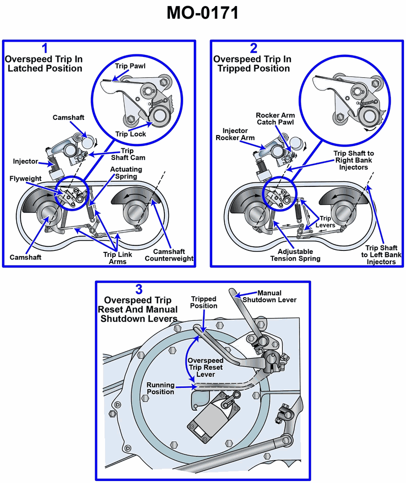 The main engines on your uninspected fishing trawler are equipped with over speed trip devices as shown in the illustration. What statement concerning the operation of the over speed trip is true? Illustration MO-0171