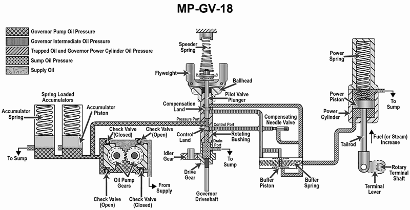 The main engines on your vessel are fitted with speed control governors based on the operating principle shown in the illustration. What statement is true concerning the illustrated pressure-compensated governor? Illustration MO-0159