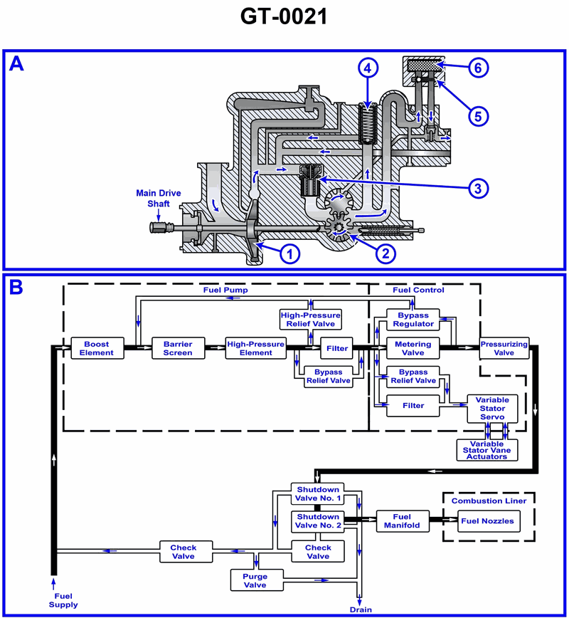 The main fuel control module used on a marine gas turbine engine as shown in the illustration, is responsible for managing which function(s)? Illustration GT-0021