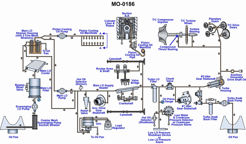 The main propulsion engines onboard your fishery research vessel use a lubricating oil system as shown in the illustration. Under what circumstances will the turbo soak-back pump operate? Illustration MO-0186