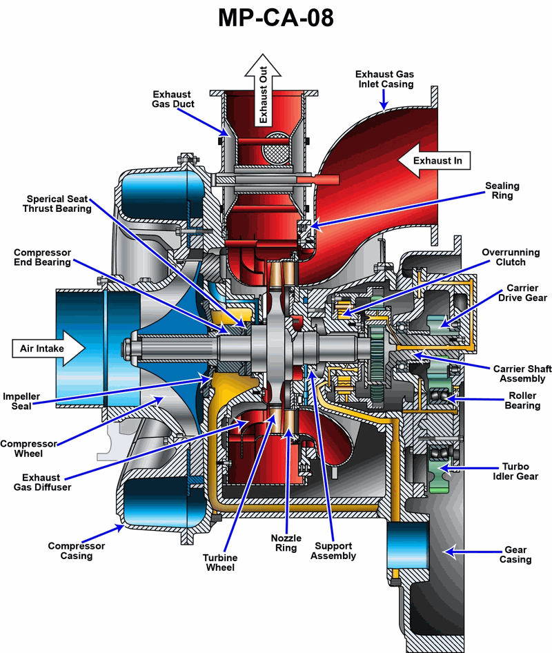 The main propulsion main engines on the ship-docking tug to which you are assigned are fitted with turbochargers as shown in the illustration. What statement is true concerning the over-running clutch and gear-drive train as fitted to this turbocharger type? Illustration MP-CA-08