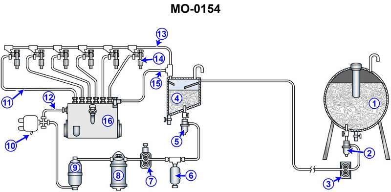 The multi-purpose supply vessel to which you are assigned has diesel generators fitted with fuel systems as shown in the illustration. What statement is true concerning items "11", "13", and "15"? Illustration MO-0154