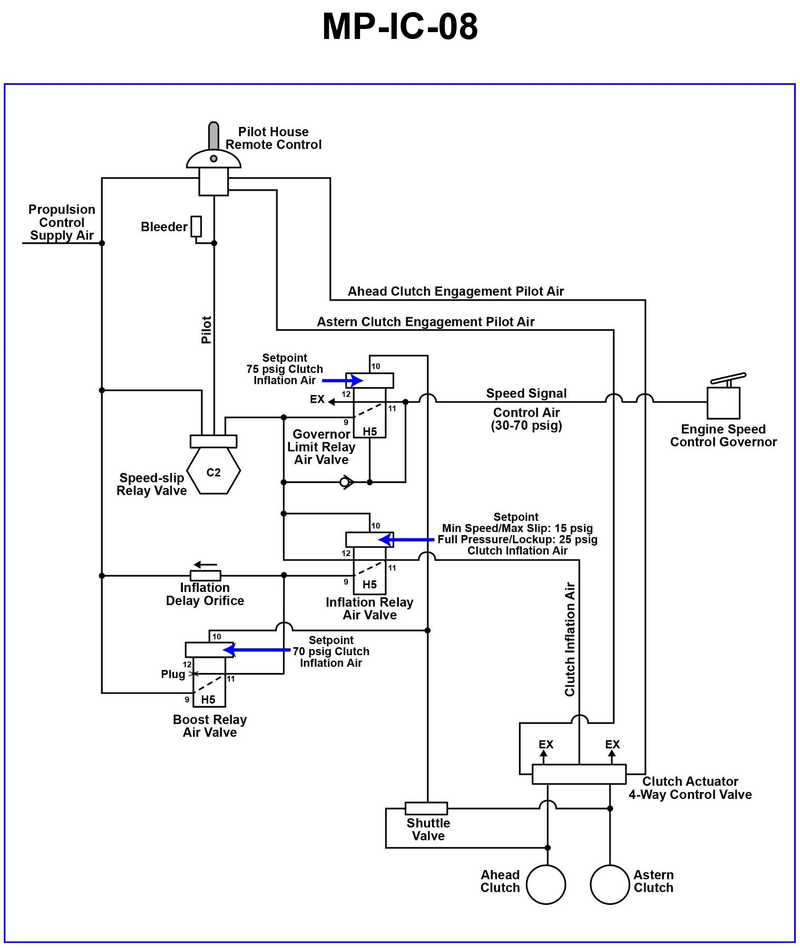 The offshore supply vessel to which you are assigned has a pneumatic propulsion control system as shown in the illustration. Which valve is responsible for processing a clutch inflation pressure at speed signal pilot pressure during periods of clutch slip maneuvering at low engine rpm? Illustration MO-0167