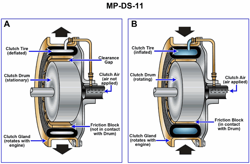 The oil platform supply vessel to which you are assigned is fitted with main propulsion engines driving through pneumatic airflex clutches as shown in the illustration. What statement is true concerning this type of clutch? Illustration MO-0141