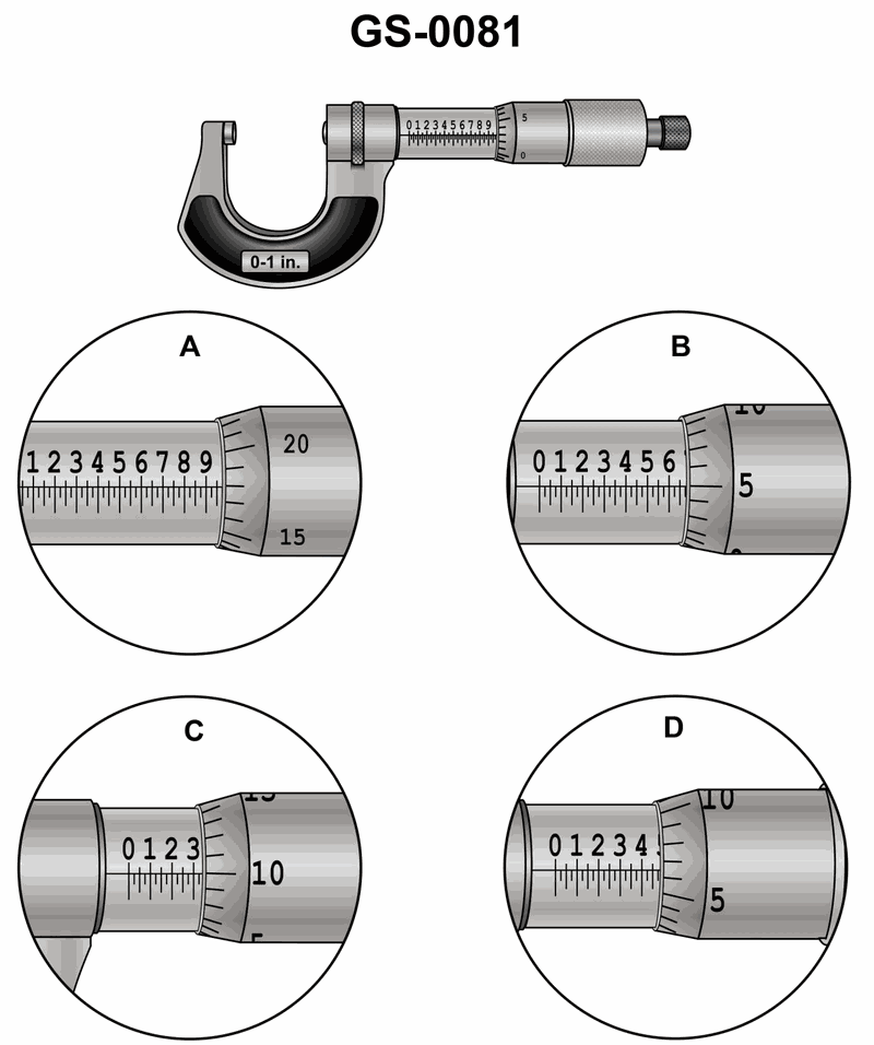 The reading on the micrometer scale shown in figure "B" in the illustration is __________. See illustration GS-0081.
