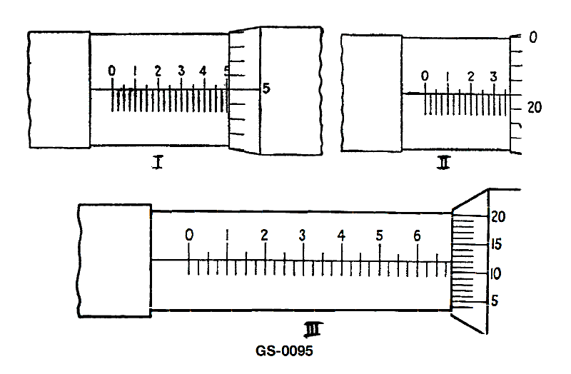 The reading on the micrometer scale shown in figure "III" in the illustration is __________. See illustration GS-0095.