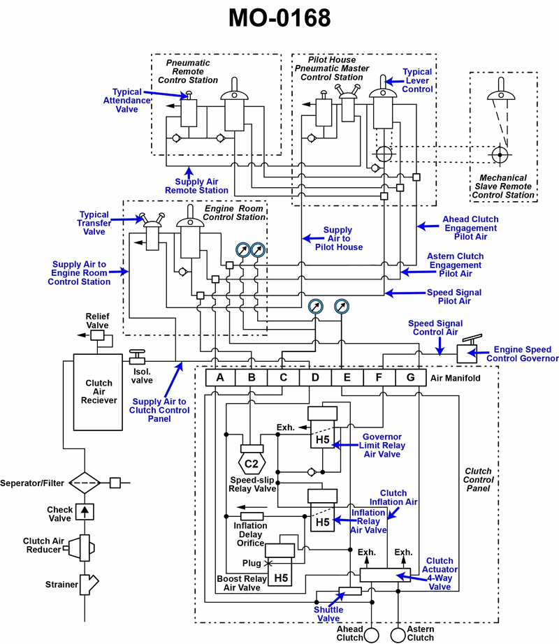 The salvage tug to which you are assigned is fitted with a totally pneumatic propulsion control system as shown in the illustration. If the astern clutch fails to engage from all control locations, but the ahead clutch properly engages from all control locations, which of the following system faults best accounts for these symptoms? Illustration MO-0168