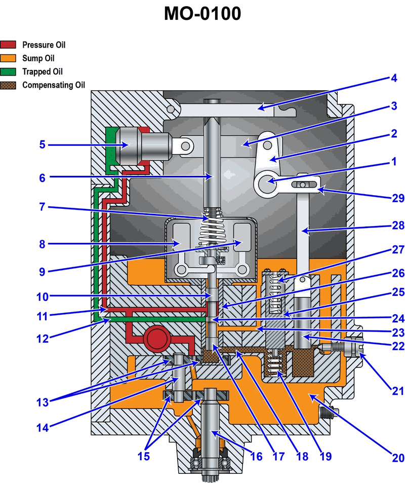 The schematic diagram of an isochronous hydraulic governor is shown in the illustration. If there is an increase in applied load, the speed will decrease, and the __________. See illustration MO-0100.