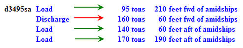 Load 95 tons---210 feet fwd of amidships Discharge 160 tons---60 feet fwd of amidships Load 140 tons---60 feet aft of amidships Load 170 tons---190 feet aft of amidships