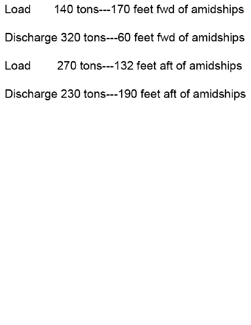The SS AMERICAN MARINER arrived in port with drafts of: FWD 18'-06", AFT 21'-10". Cargo was loaded and discharged as indicated in table ST-0123 below. Use sheet 2 in the white pages of the Stability Data Reference Book to determine the final drafts.