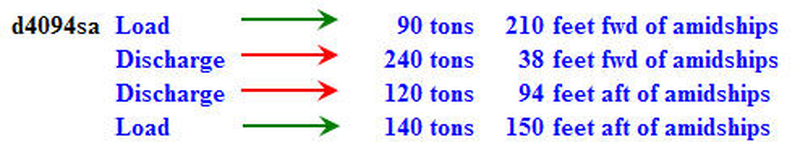 Load 90 tons--210 ft fwd of amidships Discharge 240 tons--38 ft fwd of amidships Discharge 120 tons--94 ft aft of amidships Load 140 tons--150 ft aft of amidships