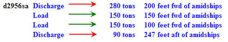Discharge 280 tons--200 ft fwd of amidships Load 150 tons--150 ft fwd of amidships Load 150 tons--100 ft fwd of amidships Discharge 90 tons--247 ft aft of amidships