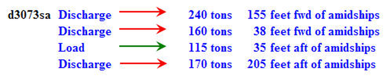 Discharge 240 tons---155 feet fwd of amidships Discharge 160 tons---38 feet fwd of amidships Load 115 tons---35 feet aft of amidships Discharge 170 tons---205 feet aft of amidships