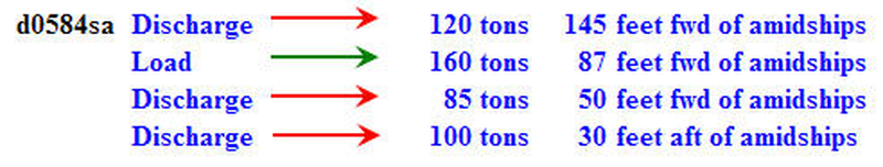Discharge 120 tons---145 feet fwd of amidships Load 160 tons---87 feet fwd of amidships Discharge 85 tons---50 feet fwd of amidships Discharge 100 tons---30 feet aft of amidships