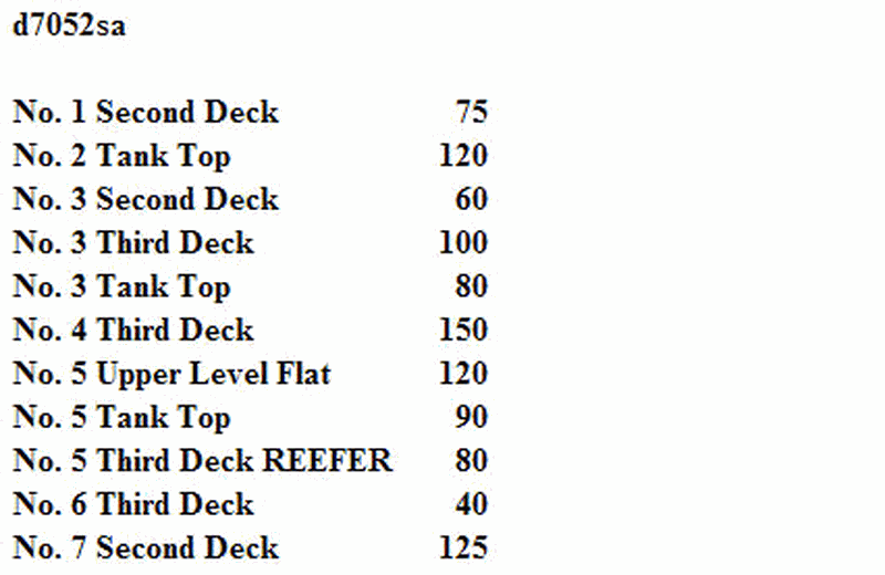 The SS AMERICAN MARINER has on board 4850 tons of cargo with an LCG-FP of 274.46 feet. See table ST-0195 below for the distribution of the cargo to be loaded. Use the white pages of The Stability Data Reference Book to determine the final LCG-FP of the cargo.