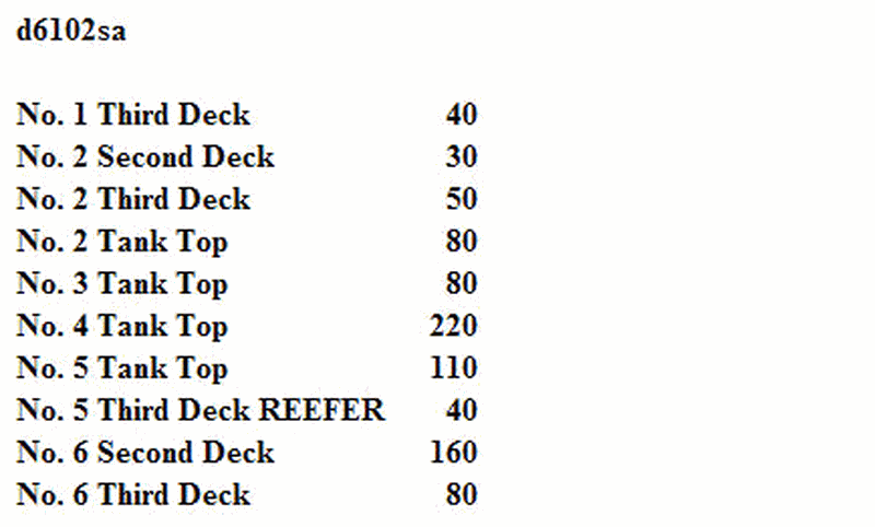 The SS AMERICAN MARINER has on board 5480 tons of cargo with an LCG-FP of 274.46 feet. See table ST-0191 below for the distribution of the cargo to be loaded. Use the white pages of The Stability Data Reference Book to determine the final LCG-FP of the cargo.