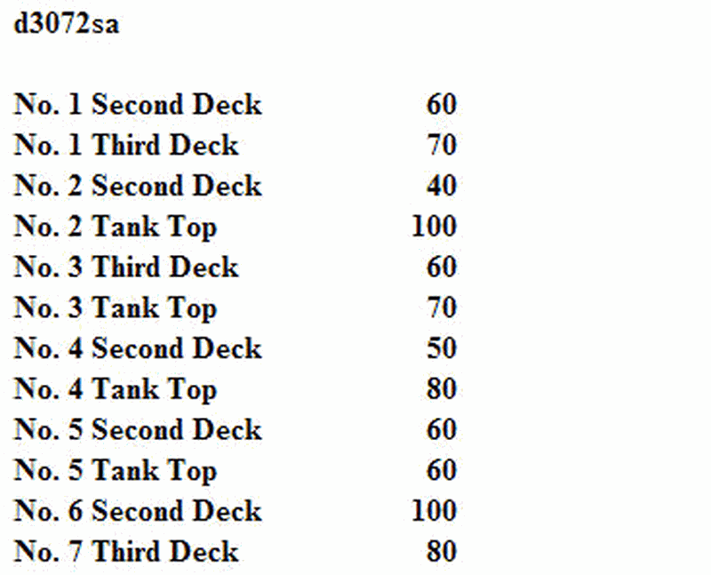 The SS AMERICAN MARINER has on board 6450 tons of cargo with an LCG-FP of 274.46 feet. See table ST-0101 below for the distribution of the cargo to be loaded. Use the white pages of The Stability Data Reference Book to determine the final LCG-FP of the cargo.