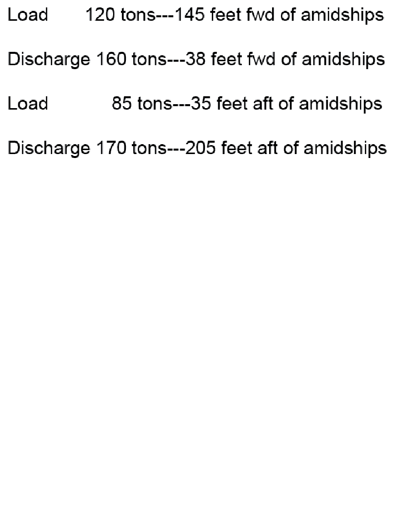 The SS AMERICAN MARINER is ready to sail with the load shown in table ST-0081 below. Use the white pages of The Stability Data Reference Book to determine the available GM. Load 120 tons---145 feet fwd of amidships Discharge 160 tons---38 feet fwd of amidships Load 85 tons---35 feet aft of amidships Discharge 170 tons---205 feet aft of amidships