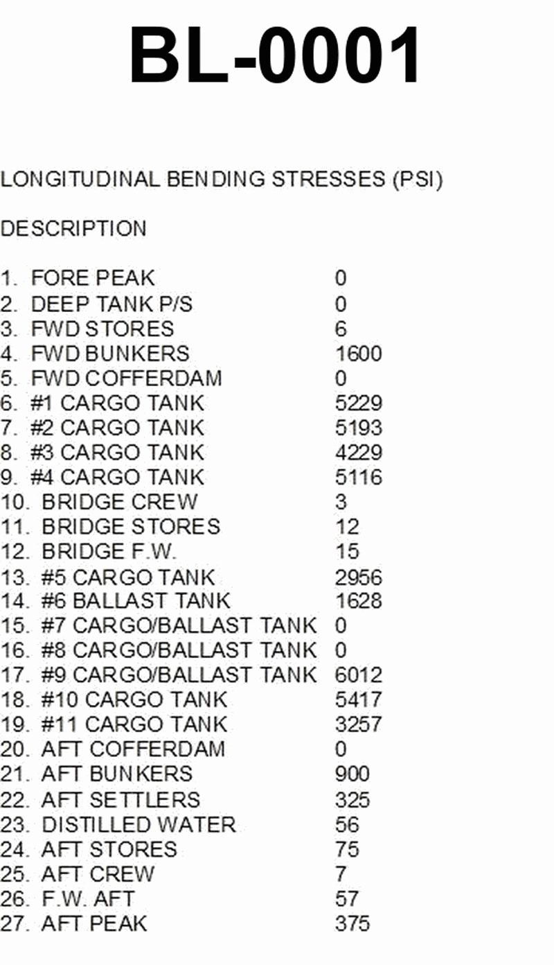 The tankship Northland is loaded as shown in table BL-0001 below. Use the salmon-colored pages in the Stability Data Reference Book to determine the hogging numeral.