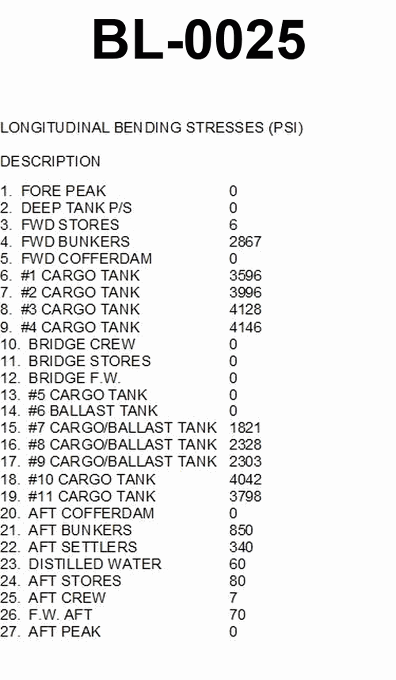 The tankship Northland is loaded as shown in table BL-0025 below. Use the salmon colored pages in the Stability book to determine the hogging numeral.