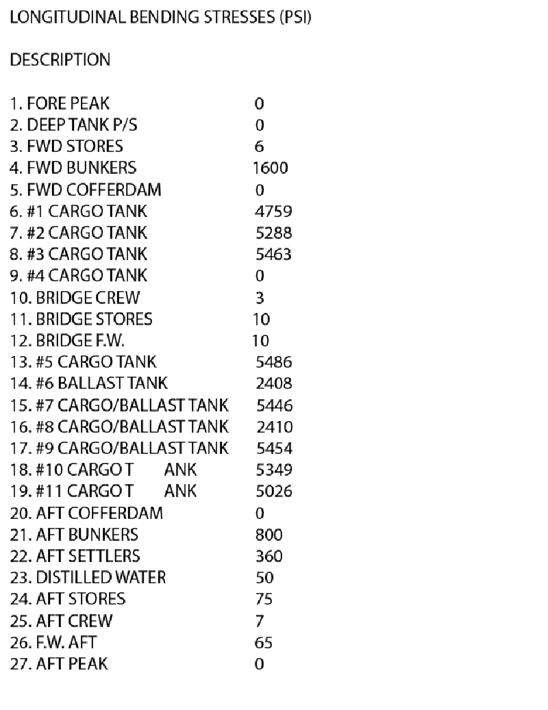 The tankship Northland is loaded as shown in table BL-0026 below. Use the salmon-colored pages in the Stability Data Reference Book to determine the sagging numeral.