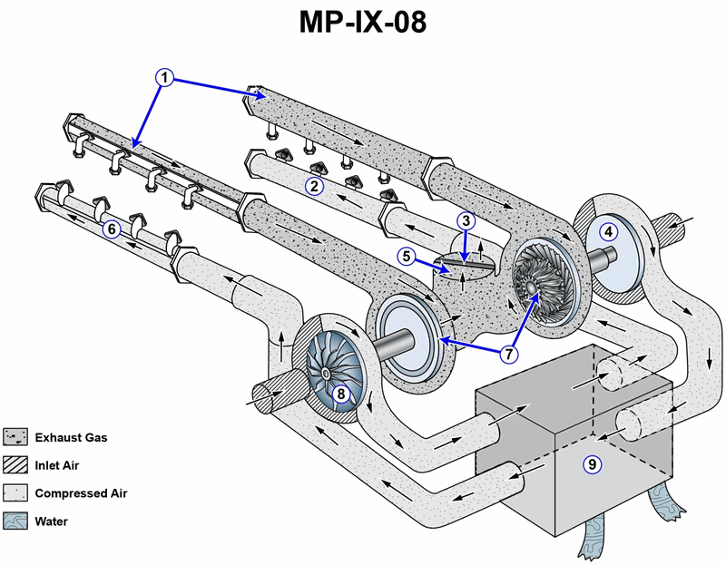 Two (2) turbochargers are used, one for each cylinder bank, to reduce exhaust back pressure.