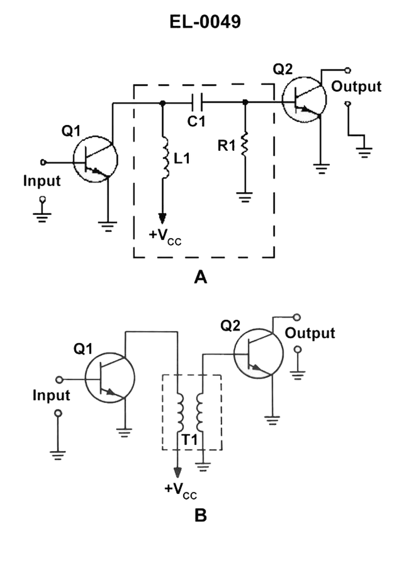 The transistors in figure "A" of the illustrated circuit are connected using what type of coupling? See illustration EL-0049.