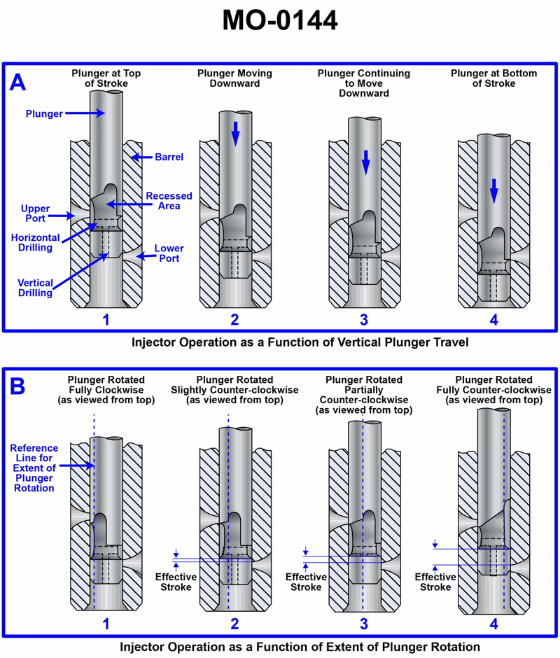 The uninspected fishing vessel to which you are assigned has a deck winch drive engine fitted with fuel injectors with the operating principle as shown in the illustration. In figure "A" which plunger travel position corresponds to when fuel injection ends? Illustration MO-0144