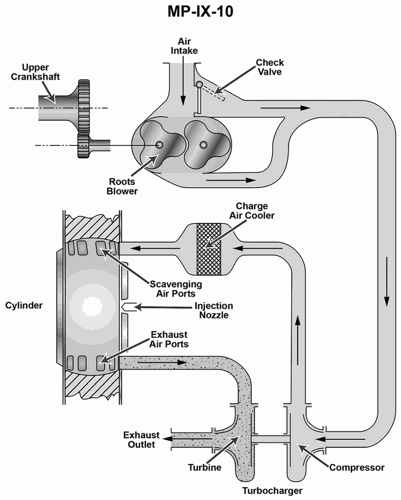 The vessel to which you are assigned has main diesel engines fitted with intake and exhaust systems as shown in the illustration. Under what circumstances would the check valve open and bypass the rotary-lobe roots blower? Illustration MO-0179