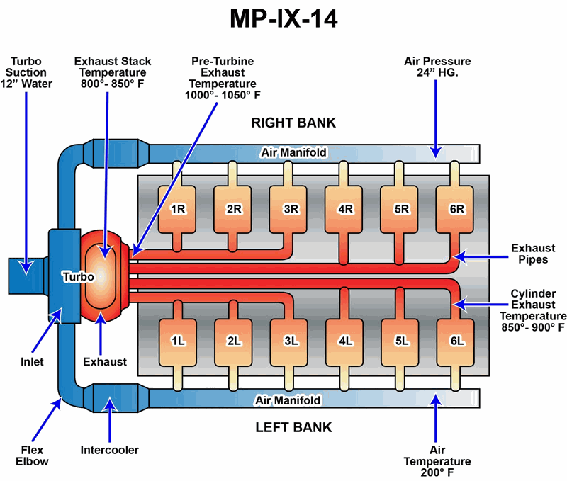 The vessel to which you are assigned has main engines fitted with intake and exhaust systems as shown in the illustration. Assume that the vacuum between the air filter and the turbocharger blower inlet is 12" of water column (negative with respect to atmospheric pressure) when the engine is running at 50% of maximum, continuous rated load. What will happen to the suction vacuum when the load is increased to 100% of maximum continuous rated load? Illustration MO-0076