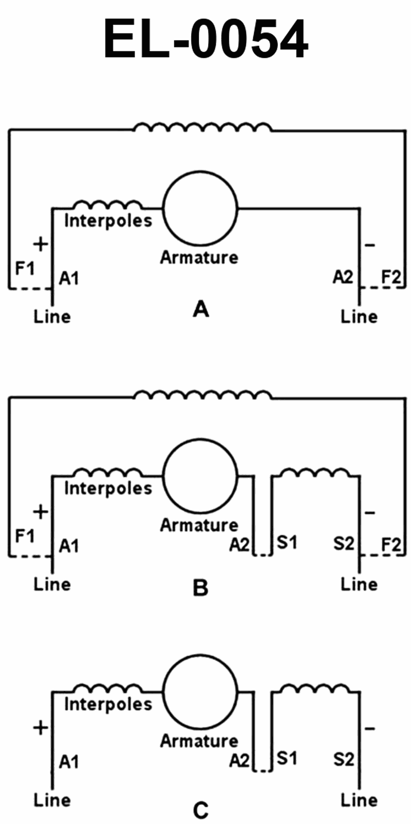 The wiring diagram found in figure "C" of the illustration represents what type of DC motor? Illustration EL-0054
