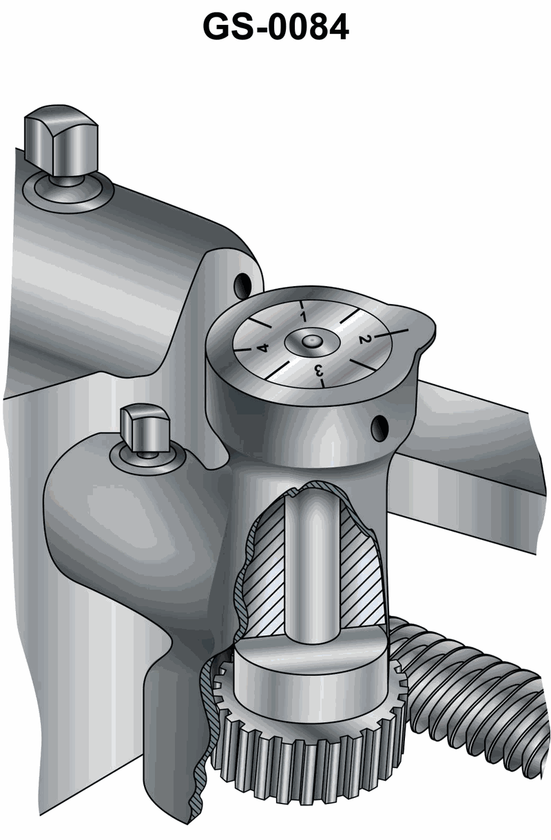 To properly cut an odd numbered thread with a lathe using the thread dial indicator illustrated, you should close the lathe split, or half-nut on __________. Illustration GS-0084