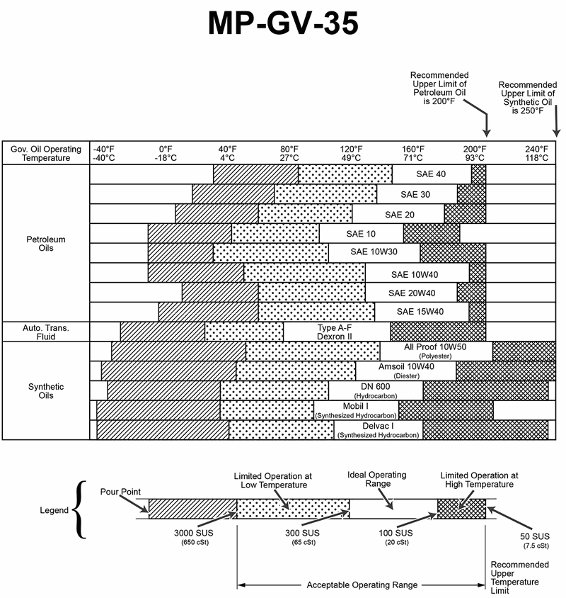 Using the oil chart provided in the illustration for guidance, which synthetic oil would be capable of providing adequate lubrication of the main engine speed control governor on your vessel, if the governor oil operating temperature shall be in the ideal operating range of 130°F to 205°F? Illustration MO-0161