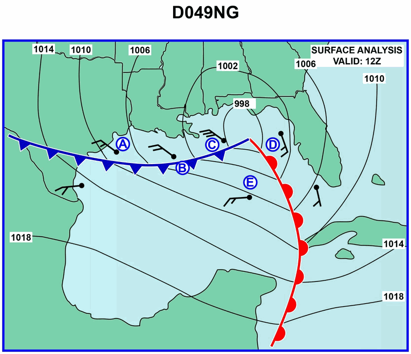 Using the surface analysis in illustration D049NG below, what change in the wind direction could be expected at position "D" if the low were moving northeasterly?