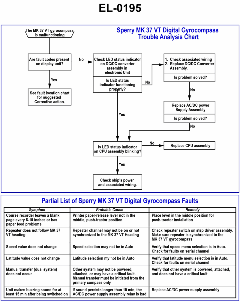 Using the trouble analysis chart and faults table provided in the illustration, if the gyrocompass was malfunctioning, but no fault codes are present on the display unit, what is most likely the problem if the DC/DC converter LED status indicator is functioning properly, but the CPU LED status indicator is not blinking? Illustration EL-0195
